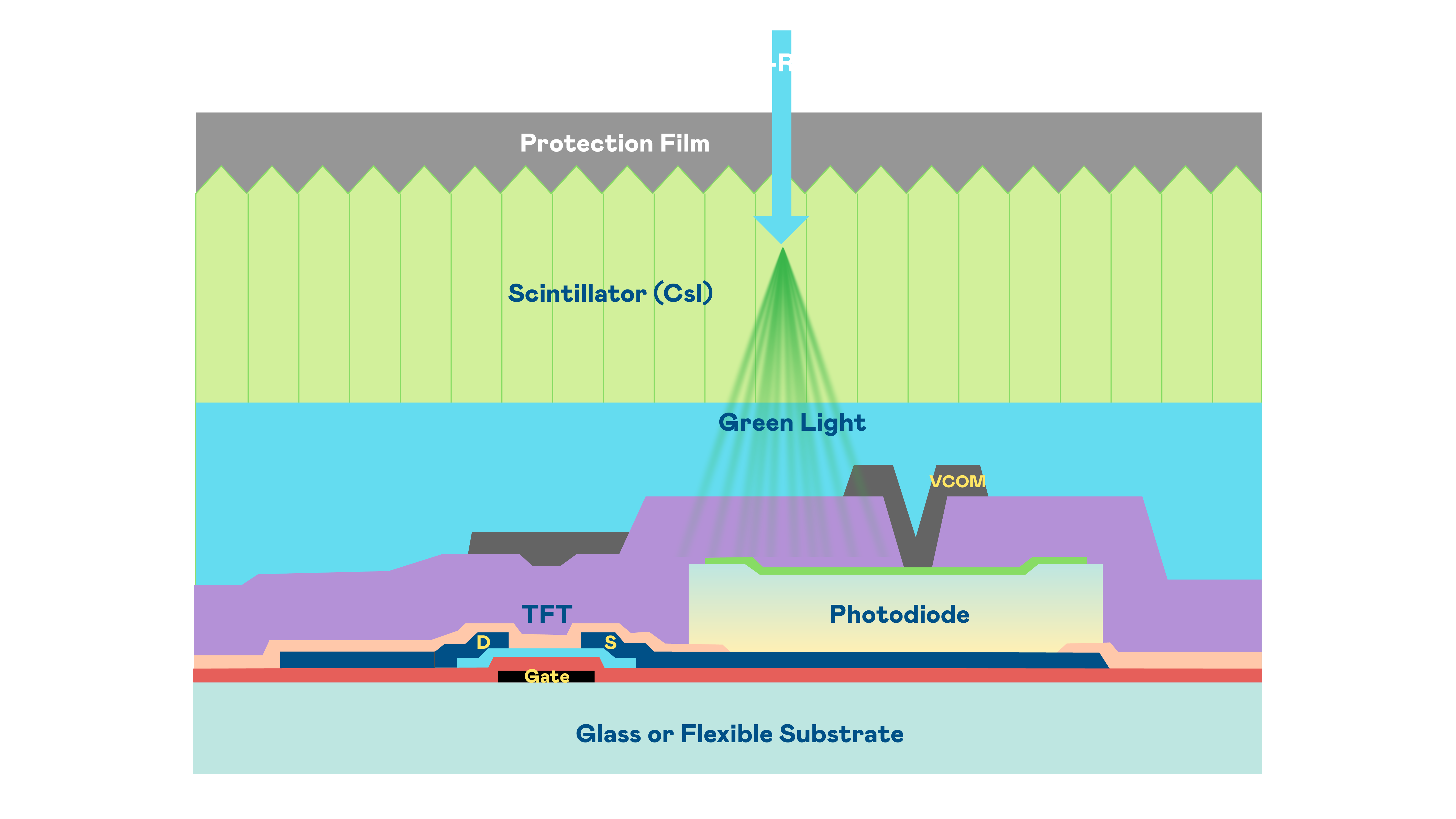 yd12399云顶的X光影像感測陣列使用薄膜電晶體 (TFT) 作為每個像素的讀取開關,搭配光電二極體(Photodiode)的光電轉換元件,用以感測X光影像訊號。
